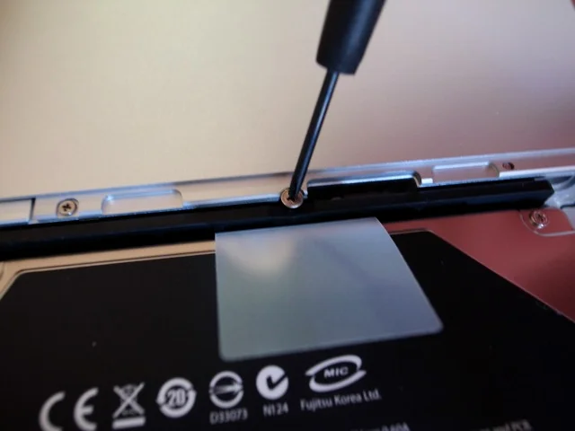 - HDD の両側面にネジが 2 つずつあるので、これを T-6 トルクスドライバーで取り外します。