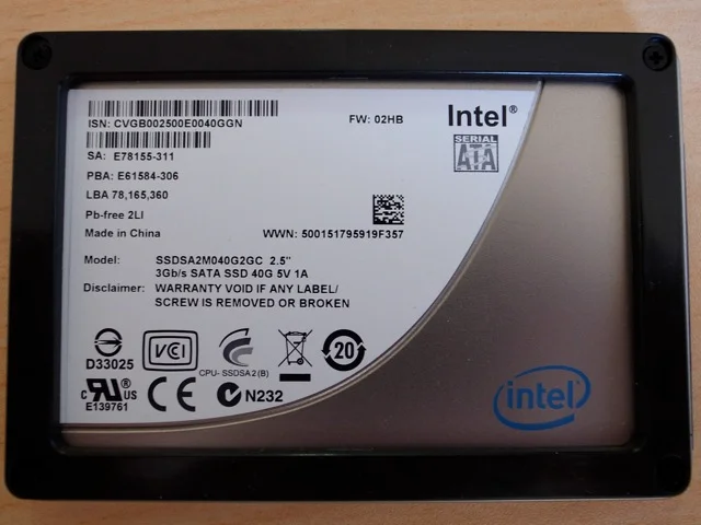 Intel X25-V(以下、X25-V)は、Intel から発売されているエントリー向けの SSD です。 容量は 40GB と少なめですが、価格は 1 万円弱と安価なことから人気になっています。