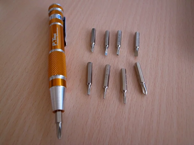 複数のビットを取り替える事ができる便利なドライバーセットです。東急ハンズ池袋店で、780 円でした。 僕の MacBook では、プラスドライバーと T-6 トルクスドライバー(星型)が必要になります。 このセットだと、プラスドライバー/マイナスドライバー/T5〜T8 トルクスドライバーのビットが付属しています。あまり使用する機会はありませんが、持っておいて損はないかな?
