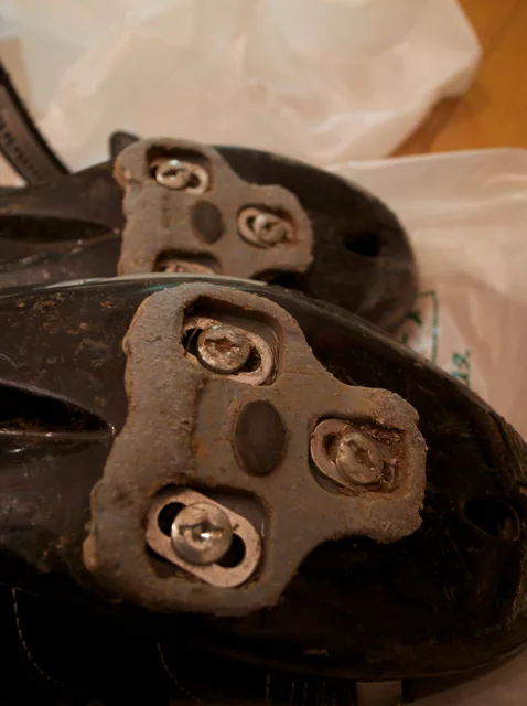 下が古いクリートの状態。もうボロボロです。 クリートカバーを付けずに歩行していたので、当たり前といえば当たり前ですね…