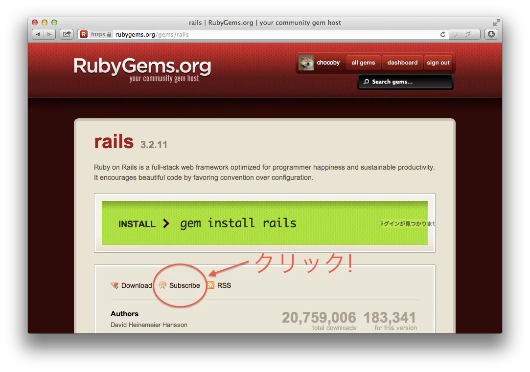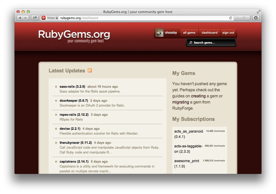 具体的にどうやって Gem の更新情報をチェックするのかというと、RubyGems.org の Subscribe を使います。 RubyGems と言えば Gem をホスティングしているサービスで、いつもお世話になっていますが、Gem の更新情報を Subscribe することで dashboard に更新情報を一覧表示することができます。