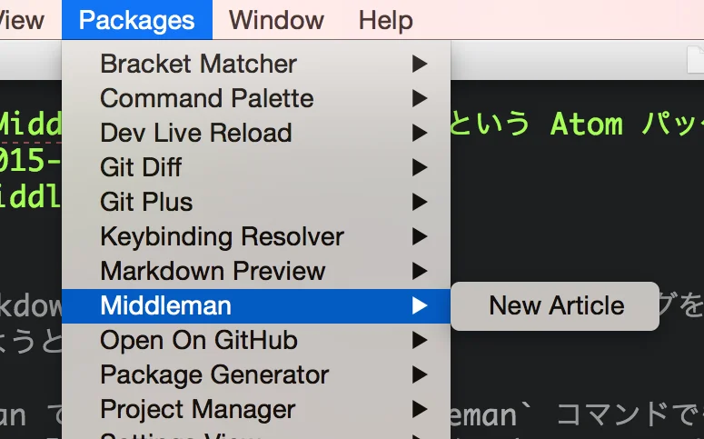middleman-article-creator をインストールした後、Command Palette を開いて